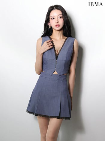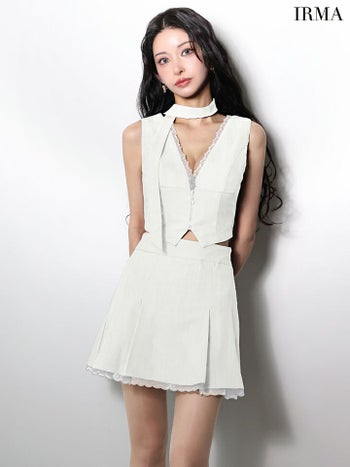 4. 【IRMA/イルマ】レース ストール付き ジップデザイン ノースリーブ セットアップ プリーツスカート フレアミニドレス (61015)