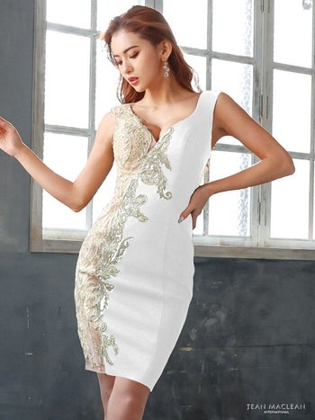 LaLaTulleが選ぶ優雅さ溢れる大人の女性へ格上げするキャバドレス♪ 【JEANMACLEAN/ジャンマクレーン】ラグジュアリー 刺繍レース ノースリーブ タイトミニドレス[アイボリー]