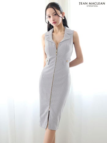 3. 【JEANMACLEAN/ジャンマクレーン】セクシー オープンバスト ジップデザイン ノースリーブ 襟デザイン ストライプ 膝丈ドレス (55059)