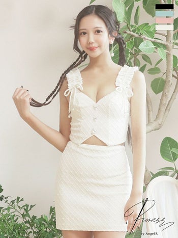 3. SALE【PURESS/ピュアレス】ノースリーブ オープンバスト パールリボンチャーム セットアップ ガーリー シャーリングショルダー タイトミニドレス (PS302415)