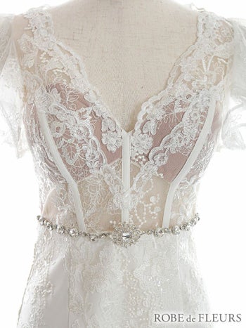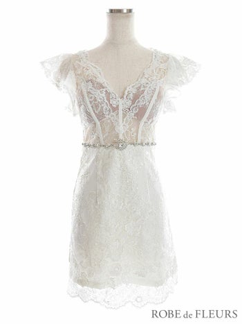 4. 【ROBEdeFLEURS/ローブドフルール】華麗 ウエストビジュー シースルーレース フリルノースリーブ タイトミニドレス(FM2632)