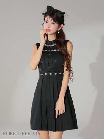 4. 【ROBEdeFLEURS/ローブドフルール】クリスタル キラキラ ビジュー スプリングツイード ガーリー ノースリーブ フレアミニドレス(fm3322)