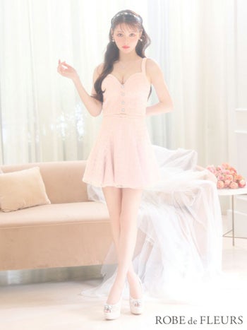 4. 【ROBEdeFLEURS/ローブドフルール】センタービジューボタン チェック柄 刺繍レース キャミソール セットアップ フレアミニドレス(fm3528)