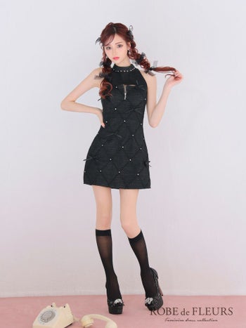 3. 【ROBEdeFLEURS/ローブドフルール】キルティング ジップデザイン バストカット ミニリボン ノースリーブ タイトミニドレス (fm3531)