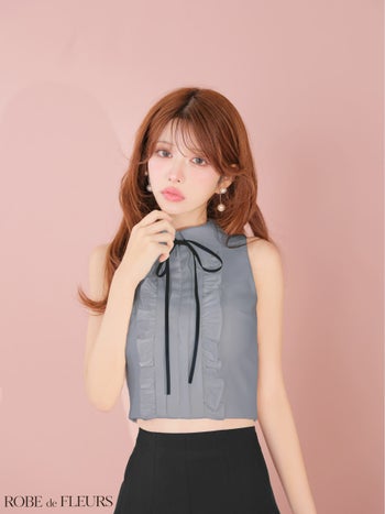 4. 【ROBEdeFLEURS/ローブドフルール】襟付き ノースリーブ プリーツスカート フリル セットアップ ガーリー リボン フレアミニドレス (fm4609)