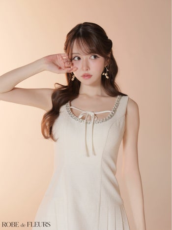 キャバドレス ROBEdeFLEURS ローブドフルール ビジューライン バストリボン プリーツスカート ノースリーブ ラメツイード フレアミニドレス