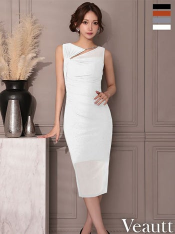 キャバドレス Veautt ヴュート デコルテカット スリット エレガント ビジューチェーン シアー ノースリーブ アシンメトリー 膝丈ドレス