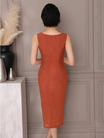 3. 【Veautt/ヴュート】デコルテカット スリット エレガント ビジューチェーン シアー ノースリーブ アシンメトリー 膝丈ドレス (VT022523)