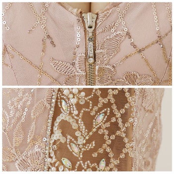 美麗 ノースリーブ フラワー スパンコールクロス フロントジップ タイトひざ丈ドレス
