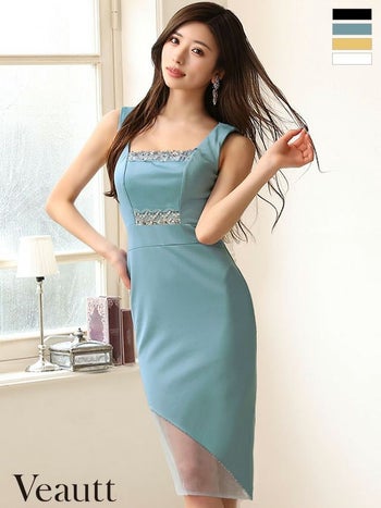XSあり!透け感がセクシー♪ 【Veautt/ヴュート】ビジュー ノースリーブ セクシー レース メッシュ 膝丈ドレス (VT032404)