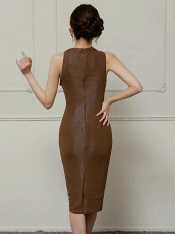 3. 【Veautt/ヴュート】アシンメトリー ノースリーブ リボンデザイン ラメ エレガント 膝丈ドレス (VT032509)