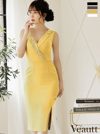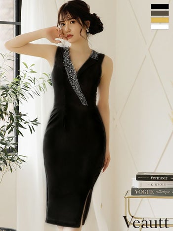 4. 【Veautt/ヴュート】スタイルアップ ビジューカラーサイドスリット タイト ひざ丈ドレス (VT06233)