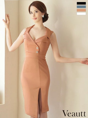 3. SALE【Veautt/ヴュート】クロスダブルカラー ノースリーブ ビジューボタン サイドスリット タイト ひざ丈ドレス(VT082403)