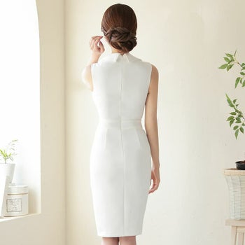 ビジューボタン ワンカラー クロスダブルカラー ノースリーブ サイドスリット タイト ひざ丈ドレス