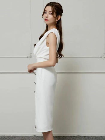 4. 【Veautt/ヴュート】ノースリーブ ウエストマーク ボタン ワンカラー シンプル スリット 膝丈ドレス (VT082527)