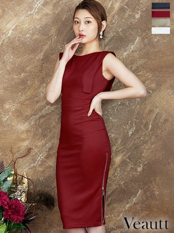 大人の個性溢れる♪ 【Veautt/ヴュート】ショルダースリットファスナービジューノースリーブひざ丈ドレス (VT14238)