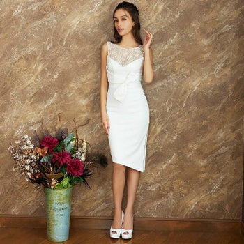 CUTEなリボンが女性心をくすぐる♪ SALE【Veautt/ヴュート】アッパーフラワーレースツイードノースリーブリボンタイトひざ丈ドレス(VT17238)