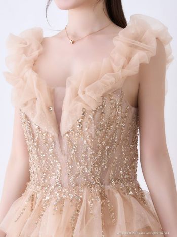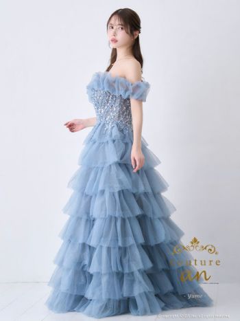 4. 【couture an/クチュール アン】ラメ オフショルダー ビジュー シアー フリル ティアード チュール レースアップ バースデー Aラインロングドレス(aocwd030)