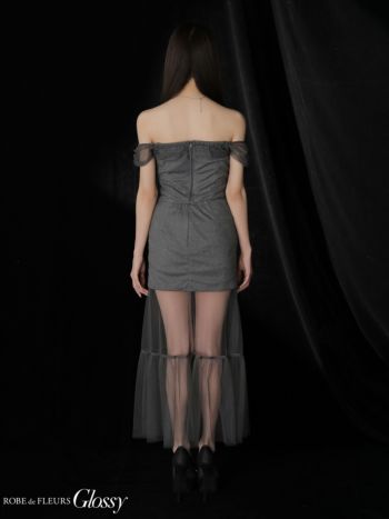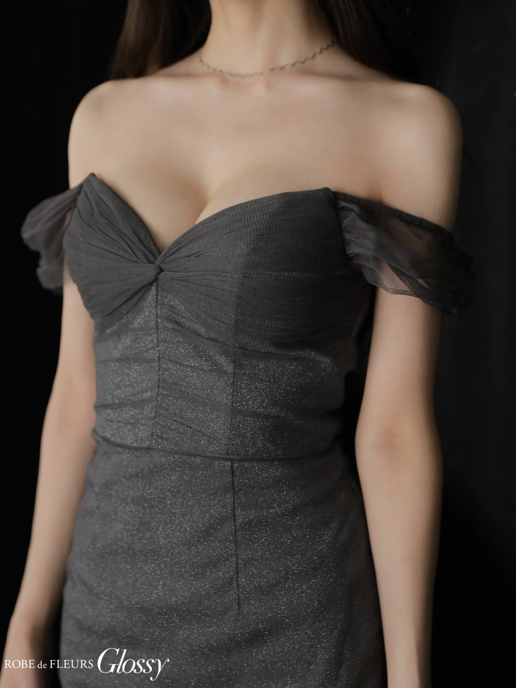 3. 【Glossy by ROBE de FLEURS/グロッシー】チュール シースルー ドレープ オフショルダー ラメニット セットアップ Aラインロングドレス(GL3968)
