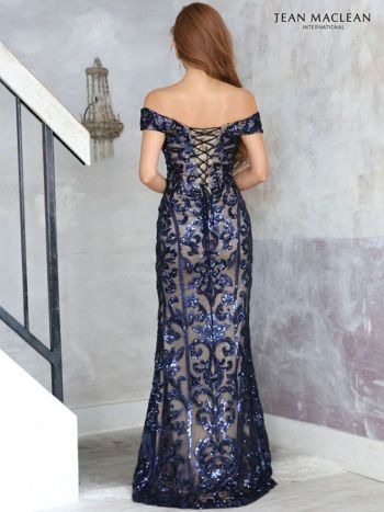 4. 【JEANMACLEAN/ジャンマクレーン】ジャガード スパンコール マーメイド オフショルダー タイトロングドレス[ネイビー×シャンパン]