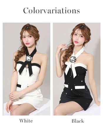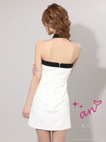 キャバドレス an アン ジップデザイン ベアトップ バイカラー ビジュー ラメ フラワー 飾りポケット フレアミニドレス
