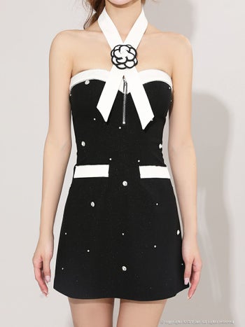 4. 【an/アン】ジップデザイン ベアトップ バイカラー ビジュー ラメ フラワー 飾りポケット フレアミニドレス(aoc4020)