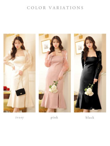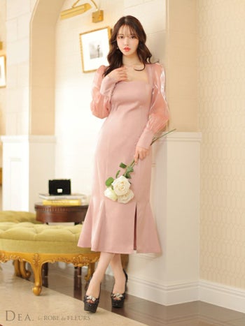Lあり!サテン素材が高級感たっぷり★ 【DEA.by ROBE de FLEURS/ディア】エレガント 長袖 オーガンジー スクエアネック オープンバスト サテン スリット マーメイドロングドレス (DE3247)
