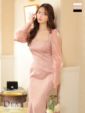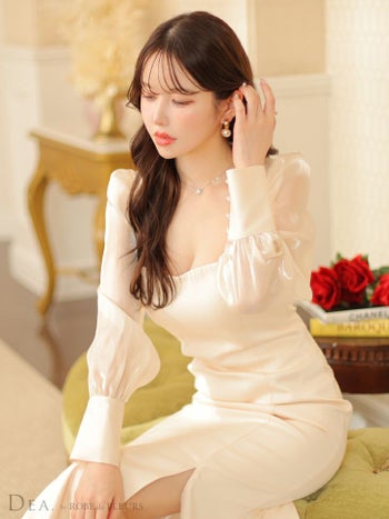4. 【DEA.by ROBE de FLEURS/ディア】オーガンジー スクエアネック オープンバスト サテン スリット エレガント 長袖 マーメイドロングドレス (DE3247)