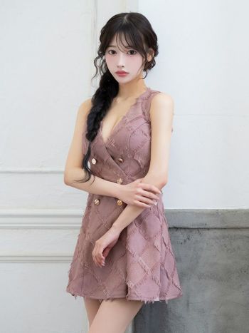 キャバドレス DEA. ROBE de FLEURS ディア ローブドフルール オープンバスト クラシカル ノースリーブ フリンジジャガード ダブルボタン フレアミニドレス