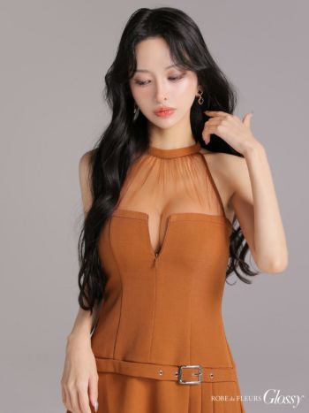 キャバドレス Glossy ROBE de FLEURS グロッシー ローブドフルール ジップデザイン プリーツスカート ホルターネック シアー チュールデザイン フレアミニドレス