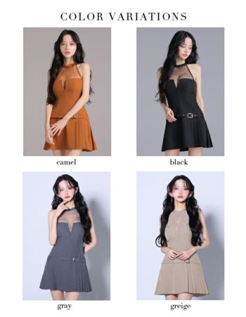 4. 【Glossy by ROBE de FLEURS/グロッシー】ジップデザイン プリーツスカート ホルターネック シアー チュールデザイン フレアミニドレス (GL4153)