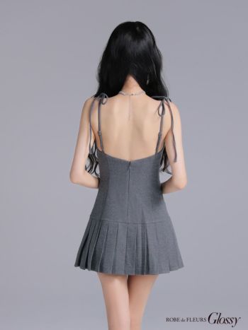 4. 【Glossy by ROBE de FLEURS/グロッシー】ジップデザイン プリーツスカート キャミソール リボンショルダー セクシー フレアミニドレス (GL4612)