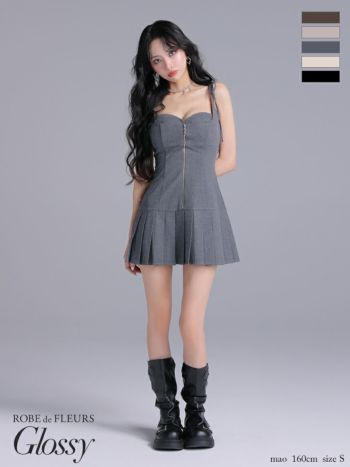 XSあり!シンプルスタイル♪ 【Glossy by ROBE de FLEURS/グロッシー】リボンショルダー キャミソール ジップデザイン セクシー プリーツスカート フレアミニドレス (GL4612)