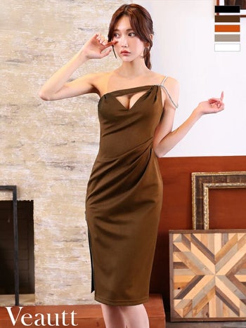キャバドレス Veautt ヴュート ビジュー バストカット ウエストタック ジップデザイン セクシー ワンショルダー 膝丈ドレス