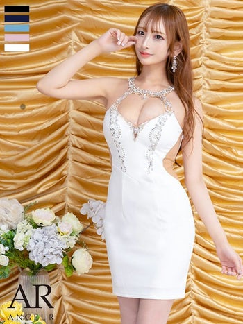 XSあり!ビジューが美しい☆ 【Angel R/エンジェルアール】ホルターネック デコルテビジュー ショルダーパールチェーン メッシュ くびれ透け セクシー オープンバスト タイトミニドレス (AR24238)