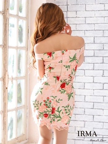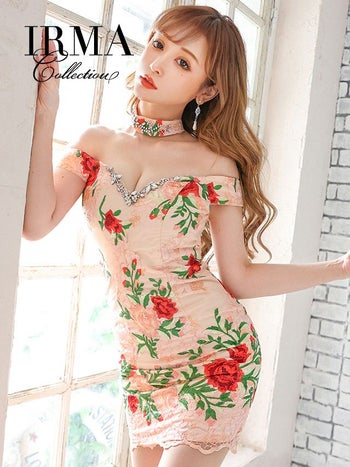 【IRMA/イルマ】チョーカー付き フラワー刺繍 オフショルダー タイトミニドレス[ピーチ][真優川咲/高級キャバドレス着用][15682]