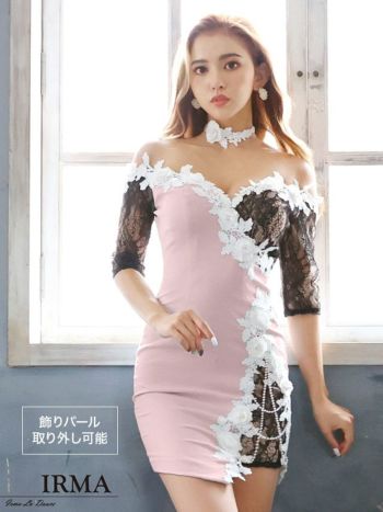 4. 【IRMA/イルマ】パールチョーカー フラワー 刺繍レース 袖あり タイトミニドレス[ダスティピンク][カレン/高級キャバドレス着用][95649]