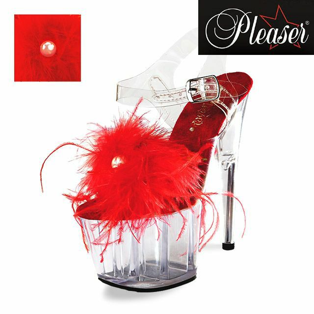 18cmヒール☆海外ブランドのキャバドレスにピッタリなストラップ付き厚底クリアサンダル♪ 【PLEASER/プリーザー】アンクル ストラップ ファー モチーフ 厚底 ハイヒール クリア サンダル[クリア×レッド][22.8cm~25.4cm][17cmヒール]