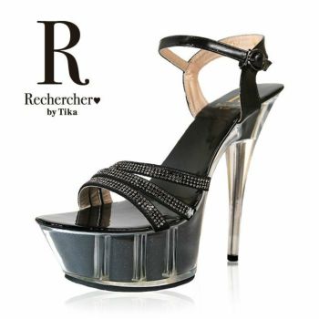 4. 【Rechercher/ルシェルシェ】キャバヒール 3連ストーンデザイン ストラップ クリアサンダル[ブラック][22.5cm~25.0cm][15cmヒール]