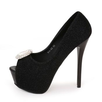 14.5cmヒール☆キラキラと輝くビジューが可愛いキャバドレスにピッタリなパンプス♪ 【Rechercher/ルシェルシェ】キャバヒール ビジュモチーフ付き ラメ オープントゥ パンプス[ブラック][22.5cm~25.0cm][14.5cmヒール]