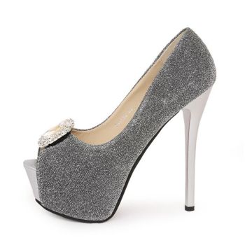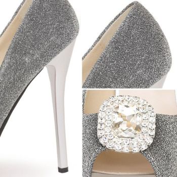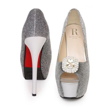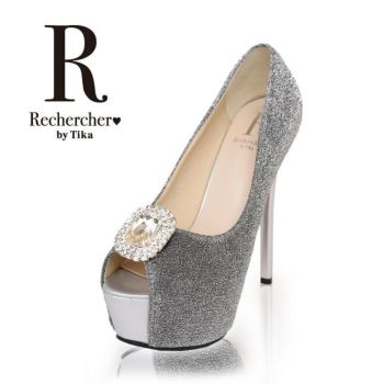【Rechercher/ルシェルシェ】キャバヒール ビジュモチーフ付き ラメ オープントゥ パンプス[シルバー][22.5cm~25.0cm][14.5cmヒール]
