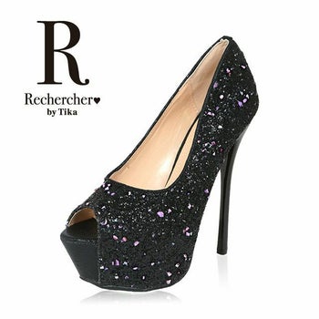 4. 【Rechercher/ルシェルシェ】キャバヒール グリッター オープントゥ パンプス[ブラック][22.5cm~25.0cm][14cmヒール]