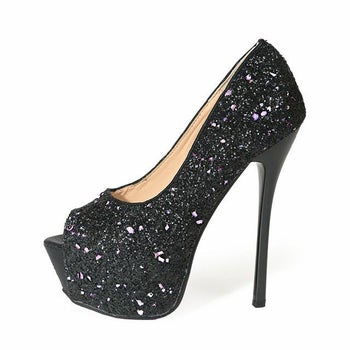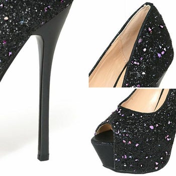 14cmヒール☆キラキラのグリッターラメが可愛いキャバドレスにピッタリなパンプス♪ 【Rechercher/ルシェルシェ】キャバヒール グリッター オープントゥ パンプス[ブラック][22.5cm~25.0cm][14cmヒール]