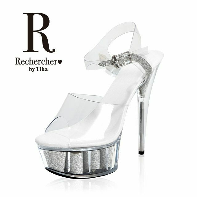 4. 【Rechercher/ルシェルシェ】キャバヒール ラメストーム 厚底 ストラップ付 クリアサンダル[シルバー][22.5cm~25.0cm][15cmヒール]