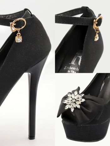 キャバシューズ Rechercher ハイヒール ストラップチャーム付き サテン ビジューリボン ガーリー オープントゥパンプス ブラック