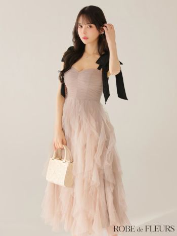 XS~Lあり!華やかで愛されシルエット♪ 予約商品【2月下旬入荷予定】【ROBEdeFLEURS/ローブドフルール】ノースリーブ チュール リボンショルダー ボリューム Aラインロングドレス (fm3463)