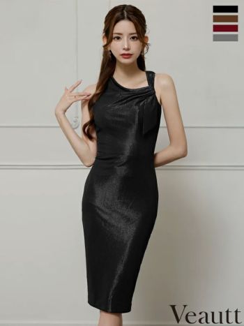 4. 【Veautt/ヴュート】エレガント アシンメトリー ノースリーブ リボンデザイン ラメ 膝丈ドレス (VT032509)