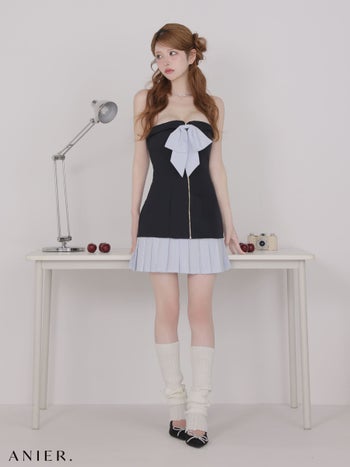 4. 【ANIER./アニエル】ベアトップ バストリボン ジップデザイン ストライプ柄 バイカラー プリーツスカート タイトミニドレス (anier4067)