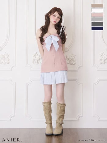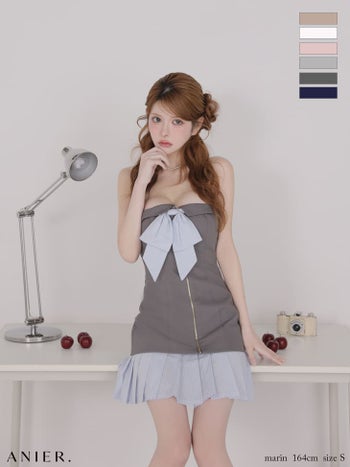 4. 【ANIER./アニエル】プリーツスカート ベアトップ バストリボン ジップデザイン ストライプ柄 バイカラー タイトミニドレス (anier4067)