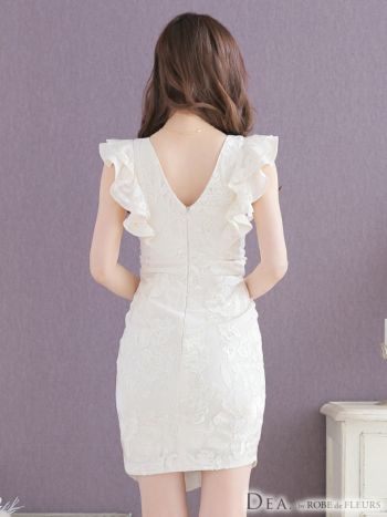 4. 【DEA.by ROBE de FLEURS/ディア】美麗 フリルノースリーブ パール付き 刺繍レース タイトひざ丈ドレス(DE2445)
